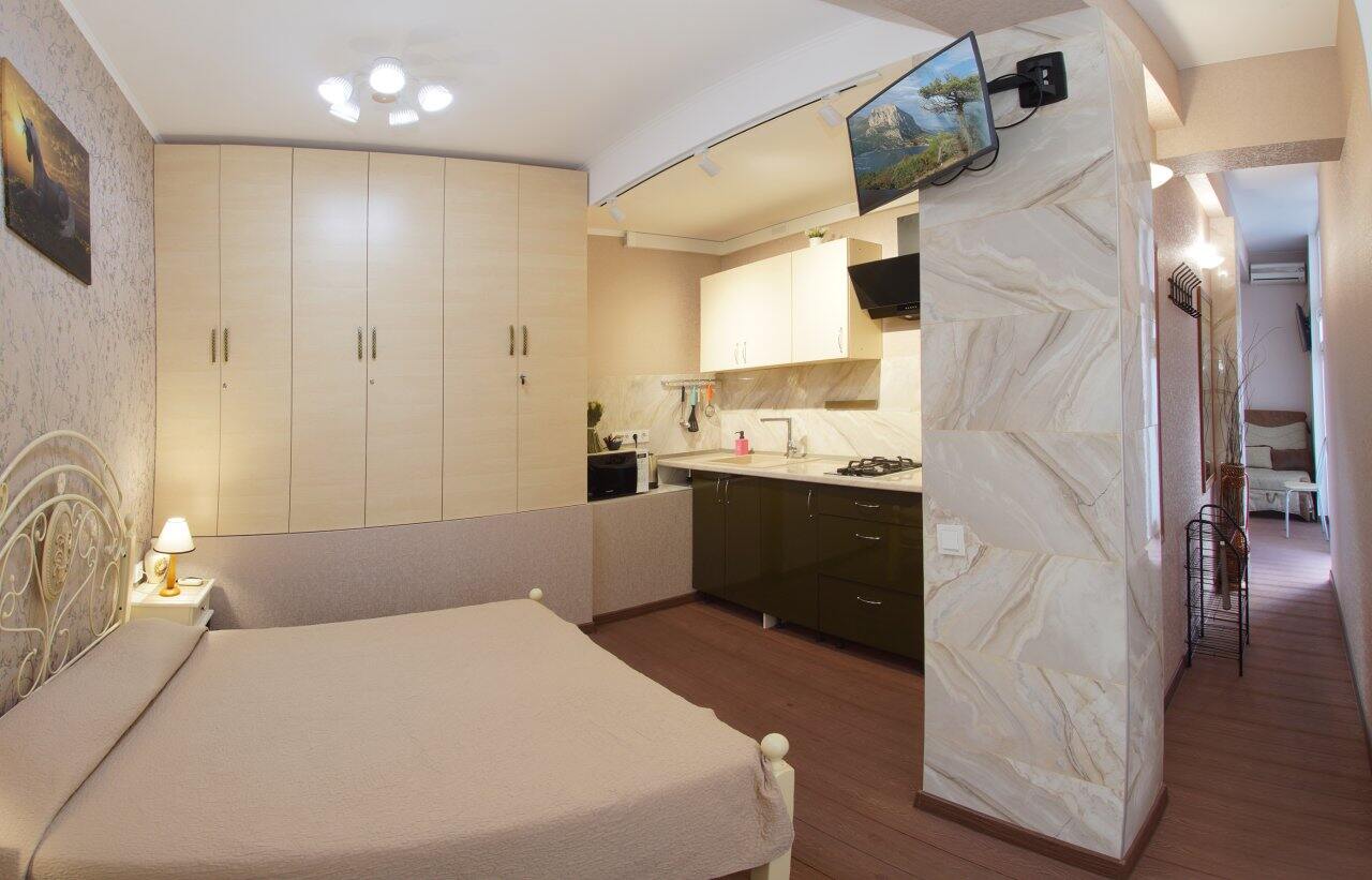 Комфортный двухкомнатный номер с кухней и террасой, расположен на 1-м этаже в отдельно стоящем здании.Номер данной категории подойдет для гостей, которые любят тишину, уединение и еду домашнего приготовления. Подойдет для размещения от 2-х до 5-х гостей. С террасы открывается вид на виноградники и прилегающею территорию.